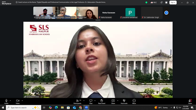 An International Virtual Lecture on the topic “Digital Etiquette and Professional Communication in the Legal Profession” was successfully organized by the International Cell, Symbiosis Law School, Nagpur, on 25 March 2026 at 04:00 PM (IST). The session aimed to equip law students with essential skills required for maintaining professionalism in digital communication, an increasingly critical aspect of contemporary legal practice.